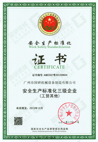 2012年12月24日,國家安全生產(chǎn)監(jiān)督管理總局為國研機械公司頒發(fā)了《安全生產(chǎn)標準化企業(yè)證書》,這意味著我司已達到《廣州市工業(yè)企業(yè)安全生產(chǎn)標準化評定辦法》及《廣州市工業(yè)企業(yè)安全生產(chǎn)標準化評定標準》的要求。