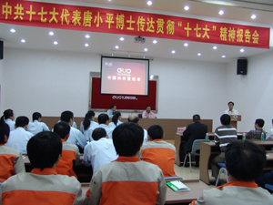 2007年11月14日下午3時,中共十七大代表唐小平博士前來我司宣講十七大精神,活動在廣州市國研機械設(shè)備制造有限公司大會議廳舉行,參加大會的有廣州市天河區(qū)組織部、宣傳部領(lǐng)導(dǎo)、珠吉街道黨工委的領(lǐng)導(dǎo)同志們以及我司全體員工,廣東電視臺、廣州日報等多家媒體派記者前來報道。大會由國研副總經(jīng)理、黨支部書記王聲躍主持, 國研董事長、總經(jīng)理王聲位作了熱情洋溢的講話,介紹了國研機械的發(fā)展規(guī)劃以及黨支部的建設(shè)情況。