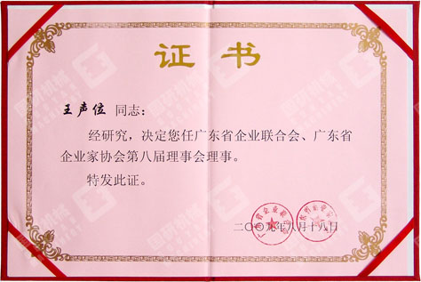 2009年8月18日,廣東省企業(yè)聯(lián)合會(huì)、廣東省企業(yè)家協(xié)會(huì)授予廣州市國(guó)研機(jī)械設(shè)備制造有限公司為省企業(yè)聯(lián)合會(huì)、省企業(yè)家協(xié)會(huì)第八屆理事會(huì)理事單位,同時(shí)授予公司董事長(zhǎng)兼總經(jīng)理王聲位同志為第八屆理事會(huì)理事。