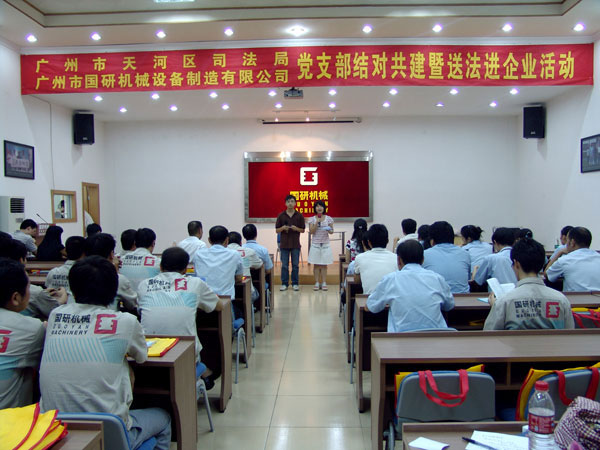9月7日下午,廣州市天河區(qū)司法局黨支部和文教工作隊(duì)一行18人在局長(zhǎng)羅育輝和副局長(zhǎng)曾曉云的帶領(lǐng)下,來(lái)到廣州市國(guó)研機(jī)械設(shè)備制造有限公司舉行黨支部結(jié)對(duì)共建暨送法進(jìn)企業(yè)活動(dòng)。