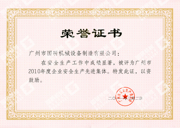 國研機(jī)械榮獲“廣州市2010年度企業(yè)安全生產(chǎn)先進(jìn)集體”稱號