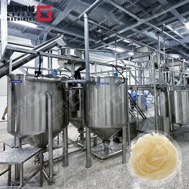 大米→射流提升輸送→除砂石→射流洗米、浸米→米水分離→磨漿→篩濾→儲(chǔ)漿→蒸粉片→粉片預(yù)干→低溫自動(dòng)吊掛老化→自動(dòng)切條、切斷→定重壓形→干燥→包裝→成品