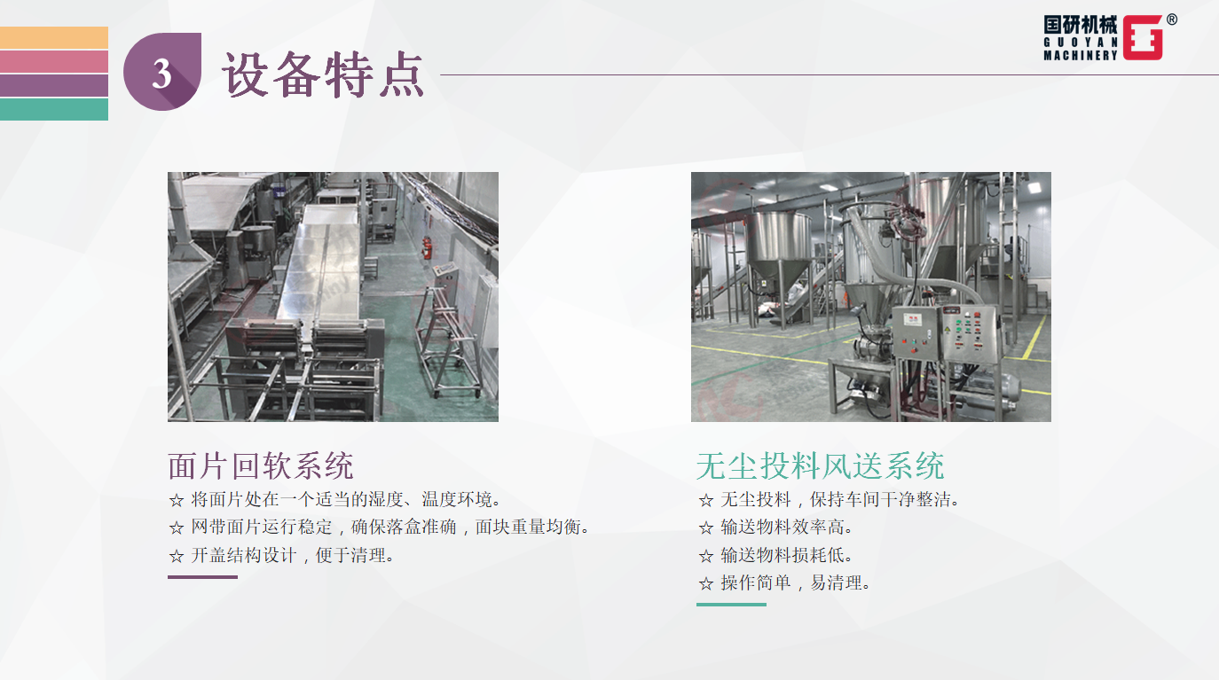 高溫半膨化非油炸方便面生產(chǎn)線,是集自動和面、自動加料、擠壓膨化、面片冷卻輸送、自動切條、分行輸送自動提升、加濕回軟切斷、自動落盒成形、自動干燥到成品輸送入包裝于一體的全自動生產(chǎn)線。該設(shè)備主要應(yīng)用于擠出式非油炸快食面的生產(chǎn),工藝流暢、功能齊全、自動化程度高,機器出品穩(wěn)定,工藝技術(shù)強于國內(nèi)同類生產(chǎn)設(shè)備,是油炸方便面廠家更新?lián)Q代的理想選擇。